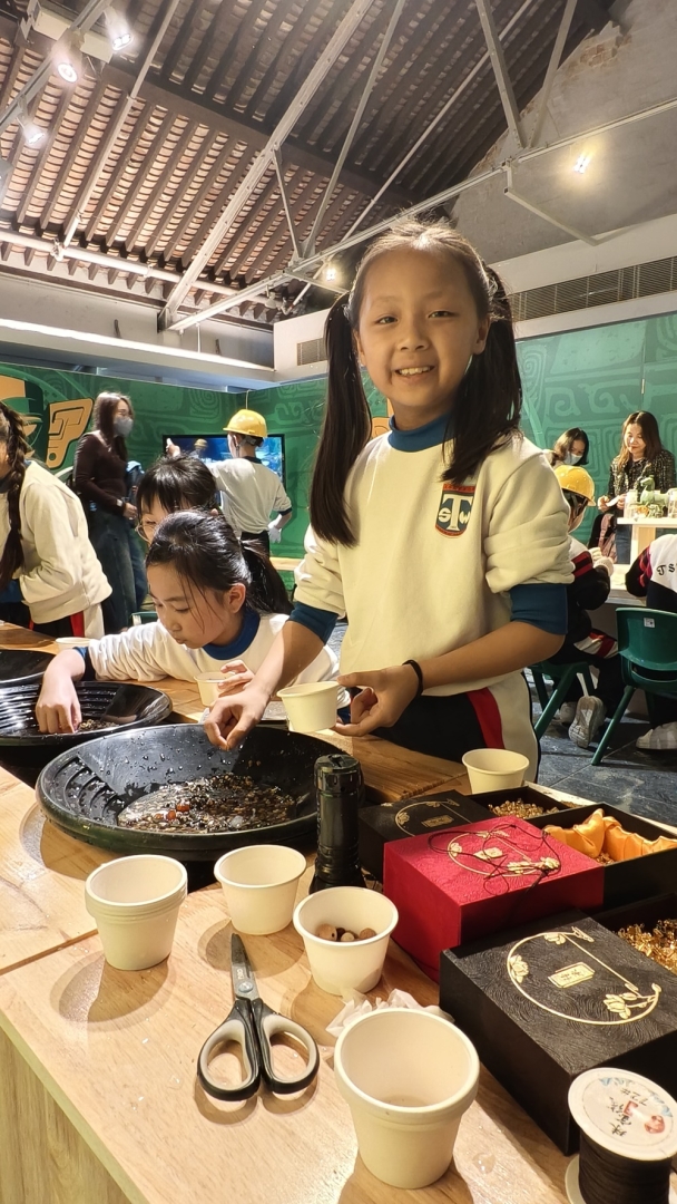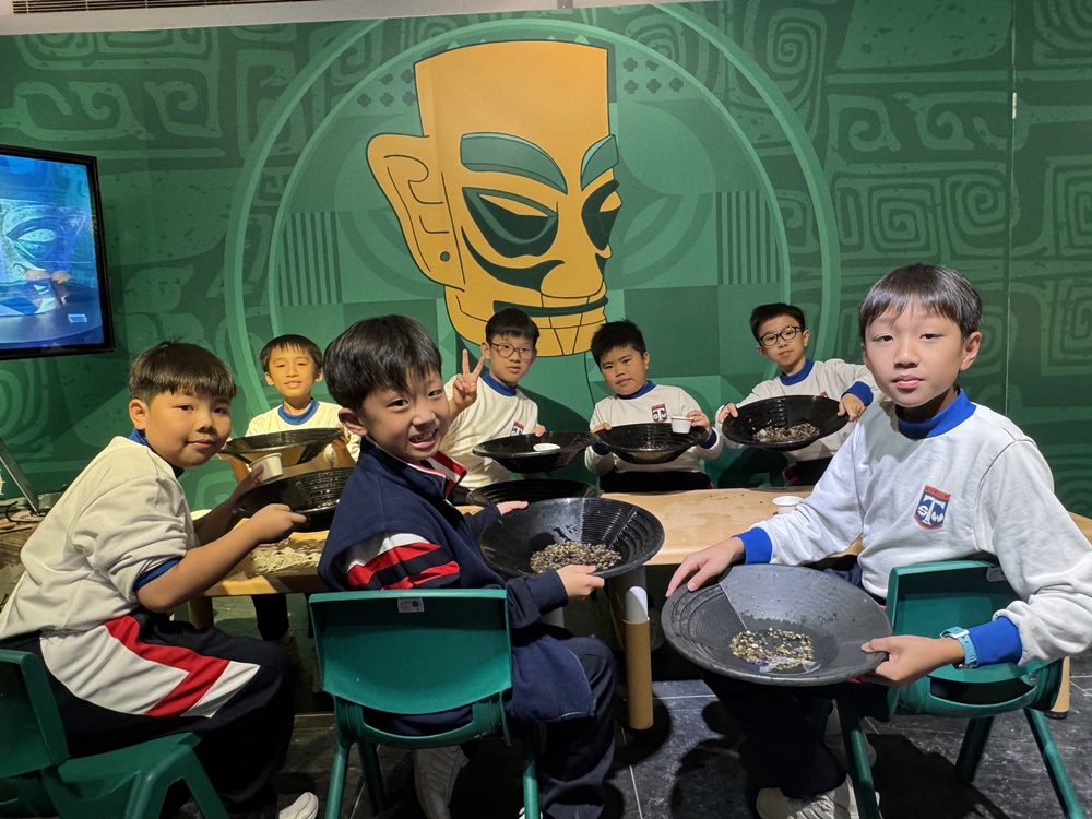 四年級學生於1月16日戶外學習日到訪饒宗頤文化館,參與「玩轉古文明」體驗活動。透過一系列結合中國古文明與科技的體驗式學習活動,包括三星堆遺址參觀、淘金體驗、考古發掘、中草藥認識、香包製作、陶器製作、森林體驗等讓學生親身實踐,激發多元學習動機,讓學生對中國古文明文化遺產及歷史發展有更深的認識,並培養他們欣賞古代藝術,以及體驗考古發掘的樂趣,藉以提升國民身份認同。此外,透過森林歷奇體驗亦讓學生了解動植物的多樣性、森林生態系統的功能,以及保護環境的重要性,確實獲益良多,樂而忘返。