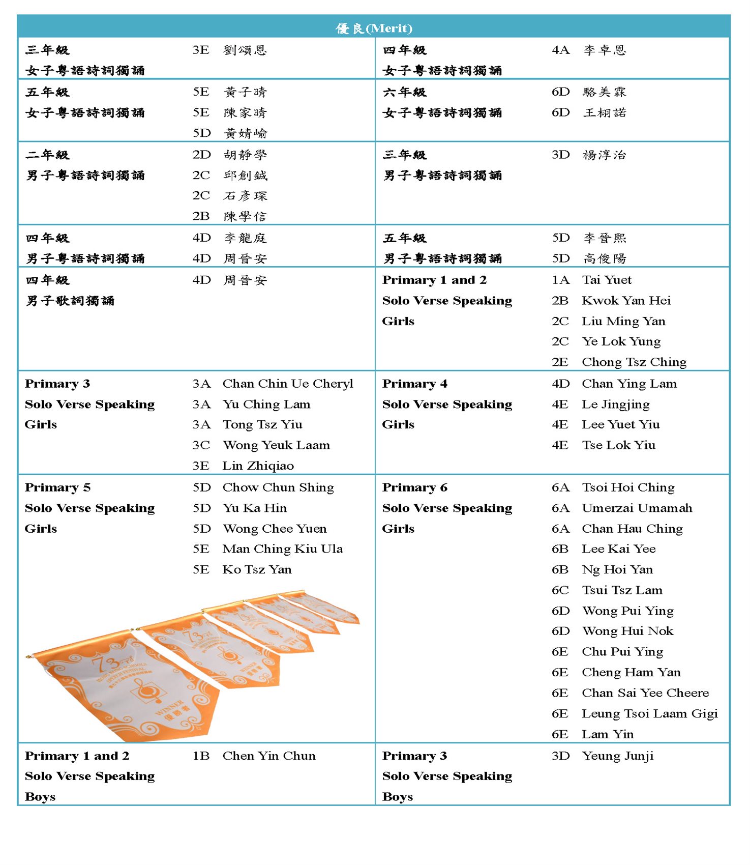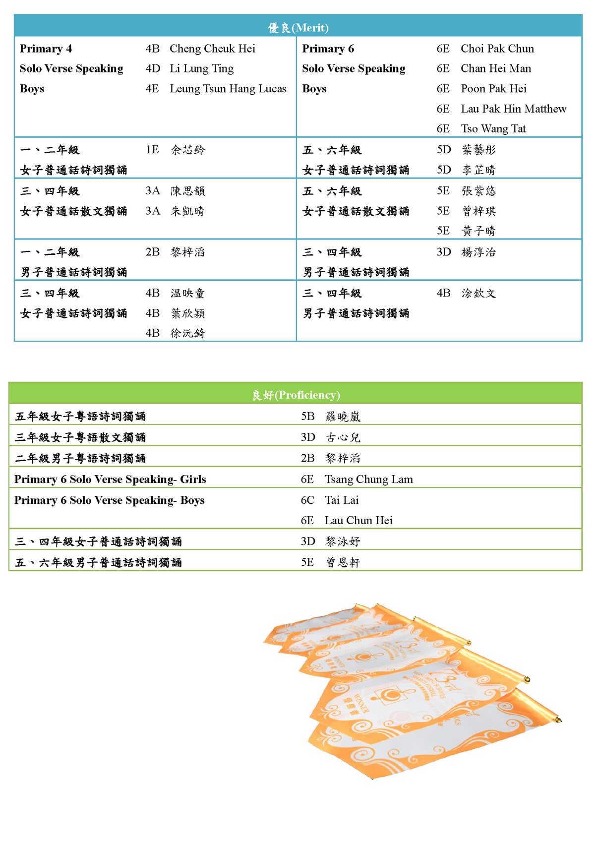 第73屆香港學校朗誦節比賽已經圓滿結束。同學們積極參與練習,老師及家長給予無限的鼓勵,因此學生表現卓著,取得優異的成績,共獲得冠軍5 個、亞軍5個、季軍7個、優良獎狀73個及良好獎狀8個,成績令人振奮。在此恭喜各得獎同學!